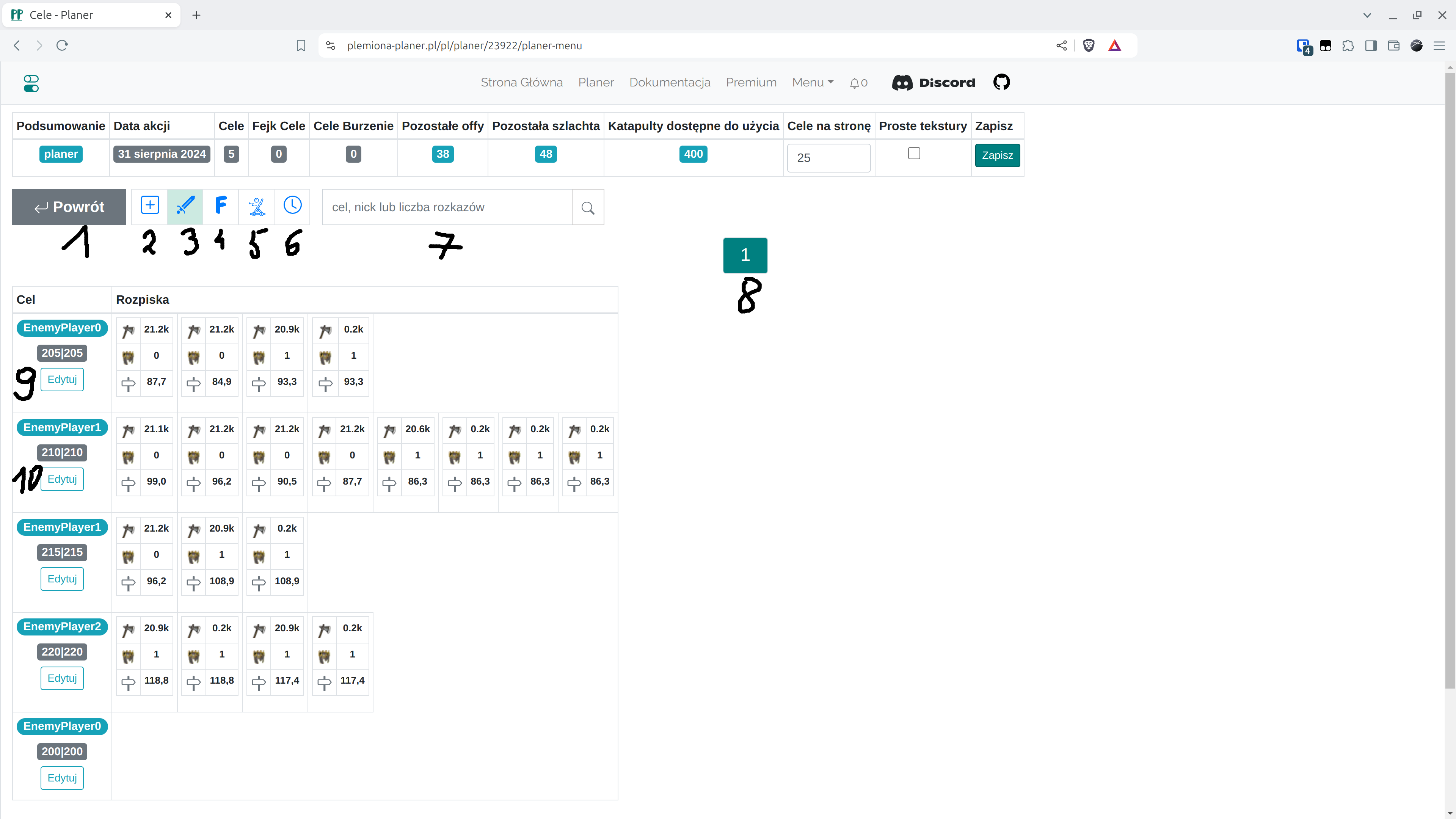 | 9,10 | Edycja pojedynczego celu ataku |